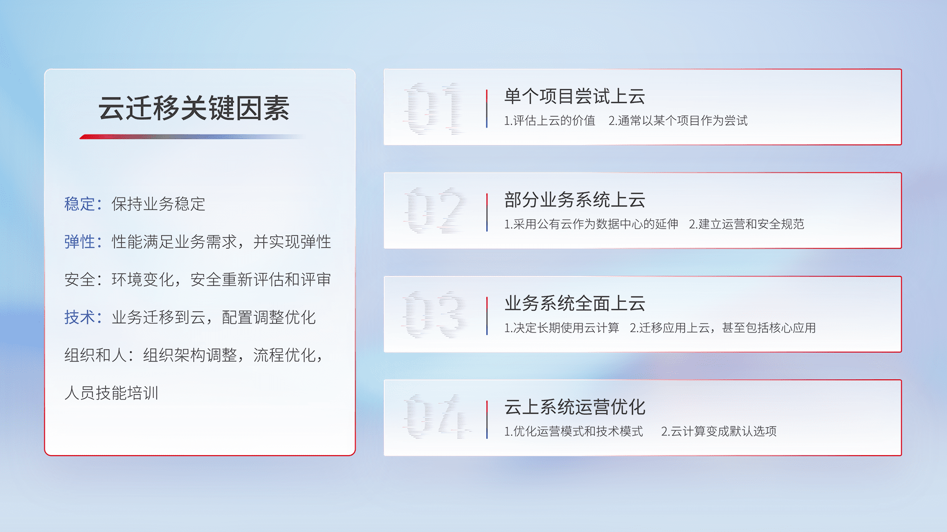 结合实际业务,,,,从规划设计、、、、云平台选型、、、、云原生改造、、、数据迁移、、、、集成交付,,,,迁移全过程为客户识别最佳上云路径,,,,做好风险识别管理,,,设计网络架构、、、身份权限、、、、安全审计合规、、、、操作审计、、、、日志审计、、监控告警策略、、、、多站点容灾设计等,,对云上基础设施进行整体规划,,提升IT治理水平,,以满足弹性、、、高可用、、、高性能的需求。。